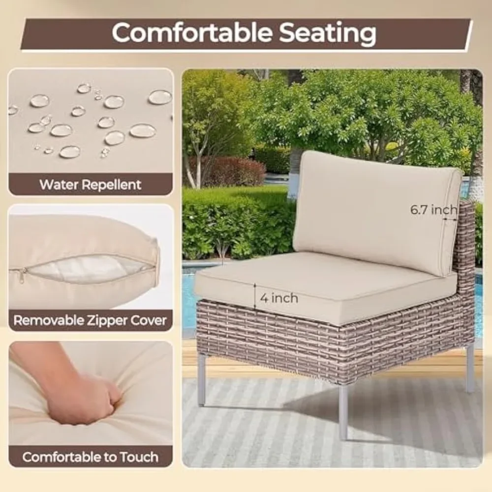 - [ERGONOMIC & CONSIDERAT BOTTOM DESIGN]: The bottom of the outdoor sectional furniture is high off the ground, allowing your legs to have a more comfortable experience and also effectively preventing moisture. The patio sets with high leg design are also convenient for daily cleaning. No need to move the whole backyard furniture when cleaning, saving time and labor. Adjustable base feet of our patio conversation sets compensate for uneven flooring, ensuring stability on any surface