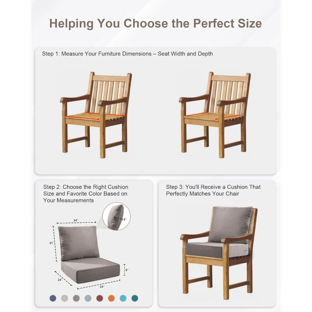- Choosing the Right Size for Your Furniture: Our outdoor chair cushions measure 24″W x 24″D x 6″T (Please measure the seating area of your furniture to ensure the cushions fit properly). These outdoor patio cushions come in various colors and sizes, perfect for outdoor chairs, dining chairs, couch, and other types of seating. Ideal for enhancing your garden, patio, balcony, beach, or any indoor and outdoor space.